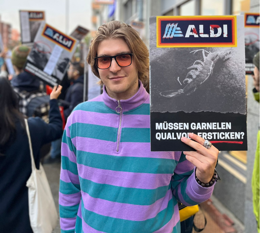 Image 1 - “Protest on prawn welfare” by Philip Kratz. Sign reads“Do shrimp have to suffocate in agony?”
